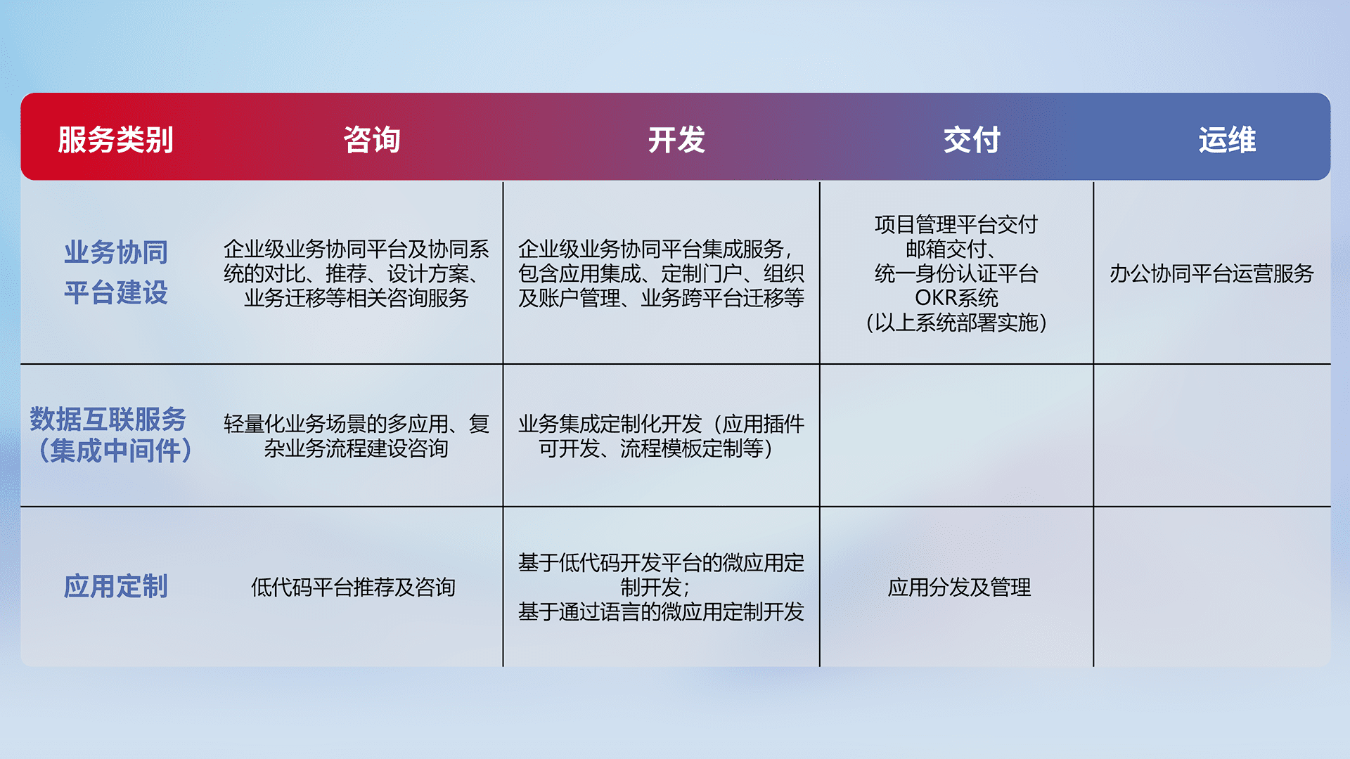 针对钉钉、、、、企微、、、、IDaas等平台级产品提供产品的规划、、、方案、、、交付、、、、定制化开发等服务,,,,实现如统一协同办公、、、、智能客户服务、、、混合会议管理、、、智能数据查询、、、等业务场景,,,,实现数字化转型。。。