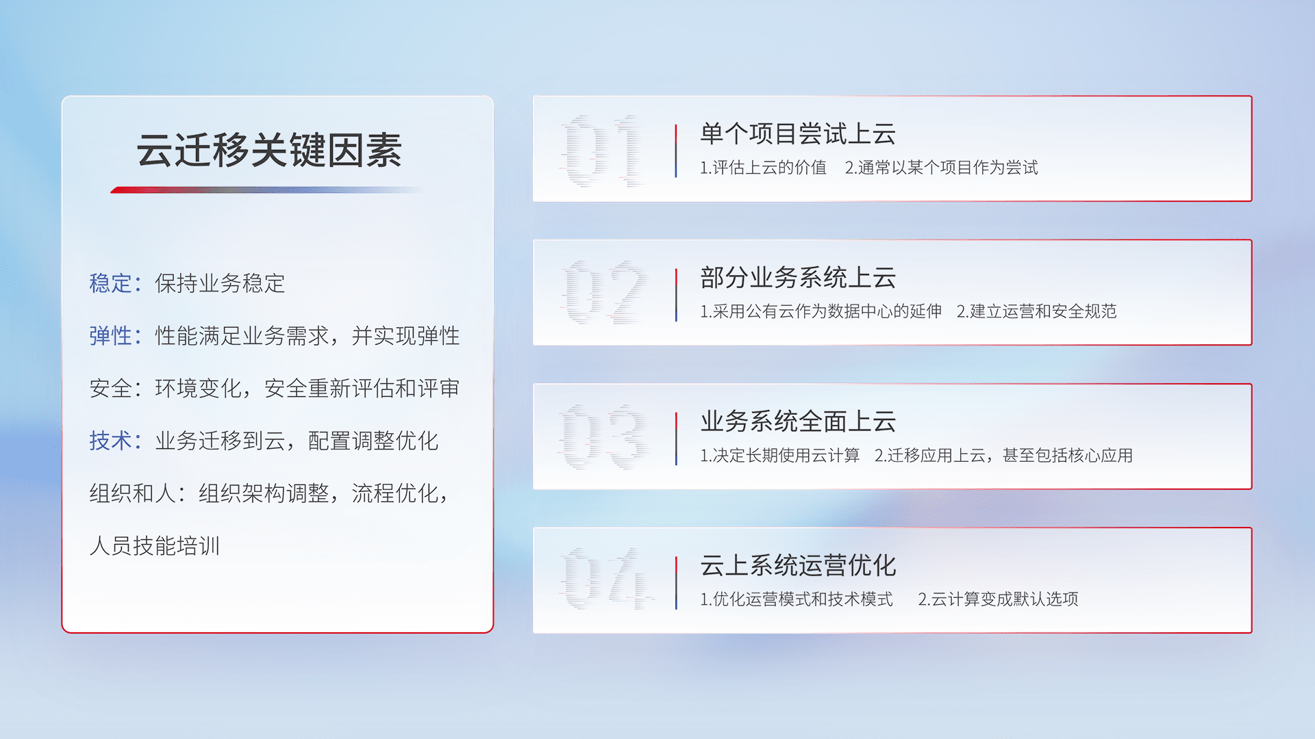 结合实际业务,,,,从规划设计、、、云平台选型、、、、云原生改造、、数据迁移、、、集成交付,,迁移全过程为客户识别最佳上云路径,,,做好风险识别管理,,,设计网络架构、、、、身份权限、、、、安全审计合规、、操作审计、、、、日志审计、、、监控告警策略、、、多站点容灾设计等,,,,对云上基础设施进行整体规划,,,提升IT治理水平,,以满足弹性、、、、高可用、、、、高性能的需求。。。。