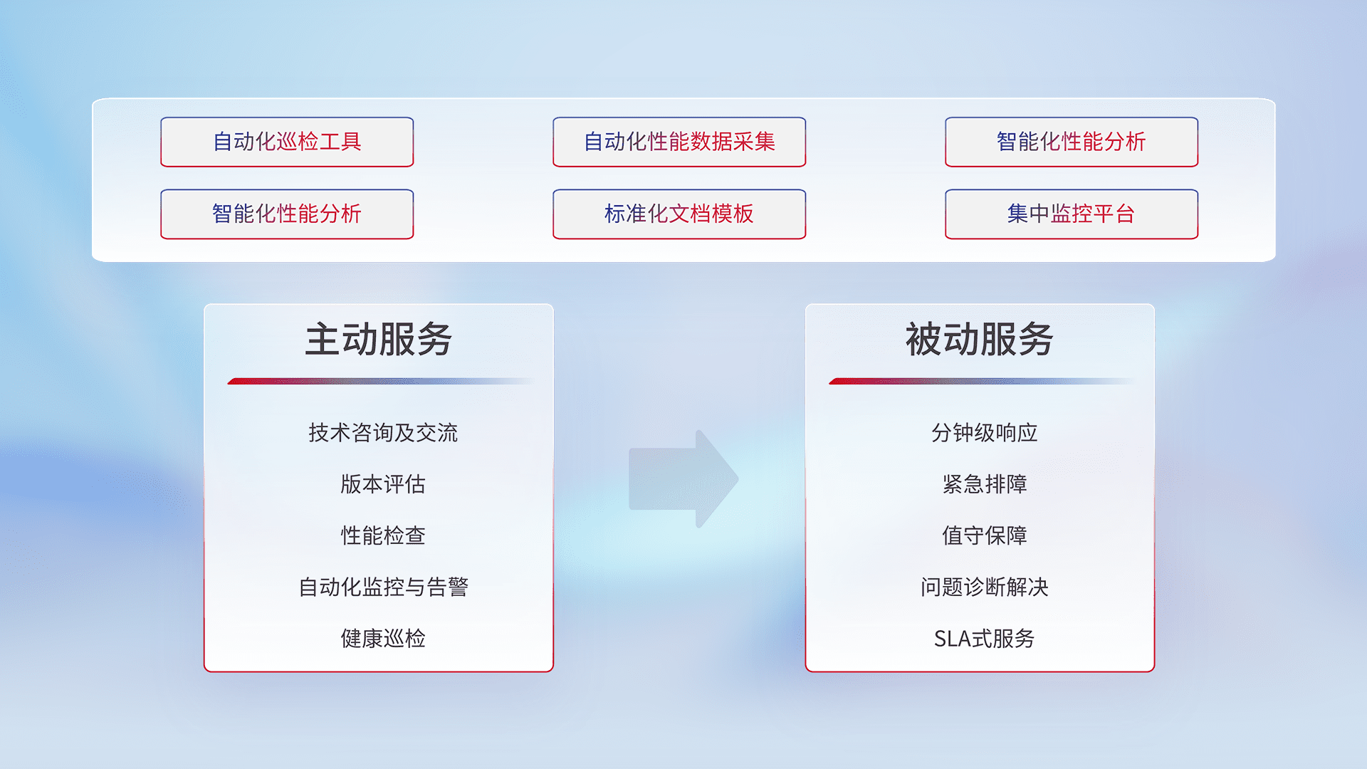 智能化工具和标准化文档,,,保障服务质量,,,提供主动服务(包含技术咨询、、、版本评估、、、性能检查、、自动化监控与告警、、、健康巡检)和被动服务包含(分钟级响应、、、紧急排障、、、、值守保障、、、、问题诊断解决、、、SLA服务)。。。